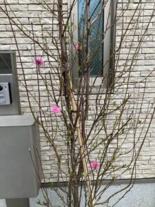 私たちのクリニックの花壇に植えているハナモモの木も、ピンクの花が5輪くらい咲いています。
