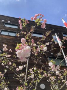 そして、あいパルさんの東側、私たちのクリニックから見えるところに、八重桜が3分咲きくらいでしょうか、咲き始めました。